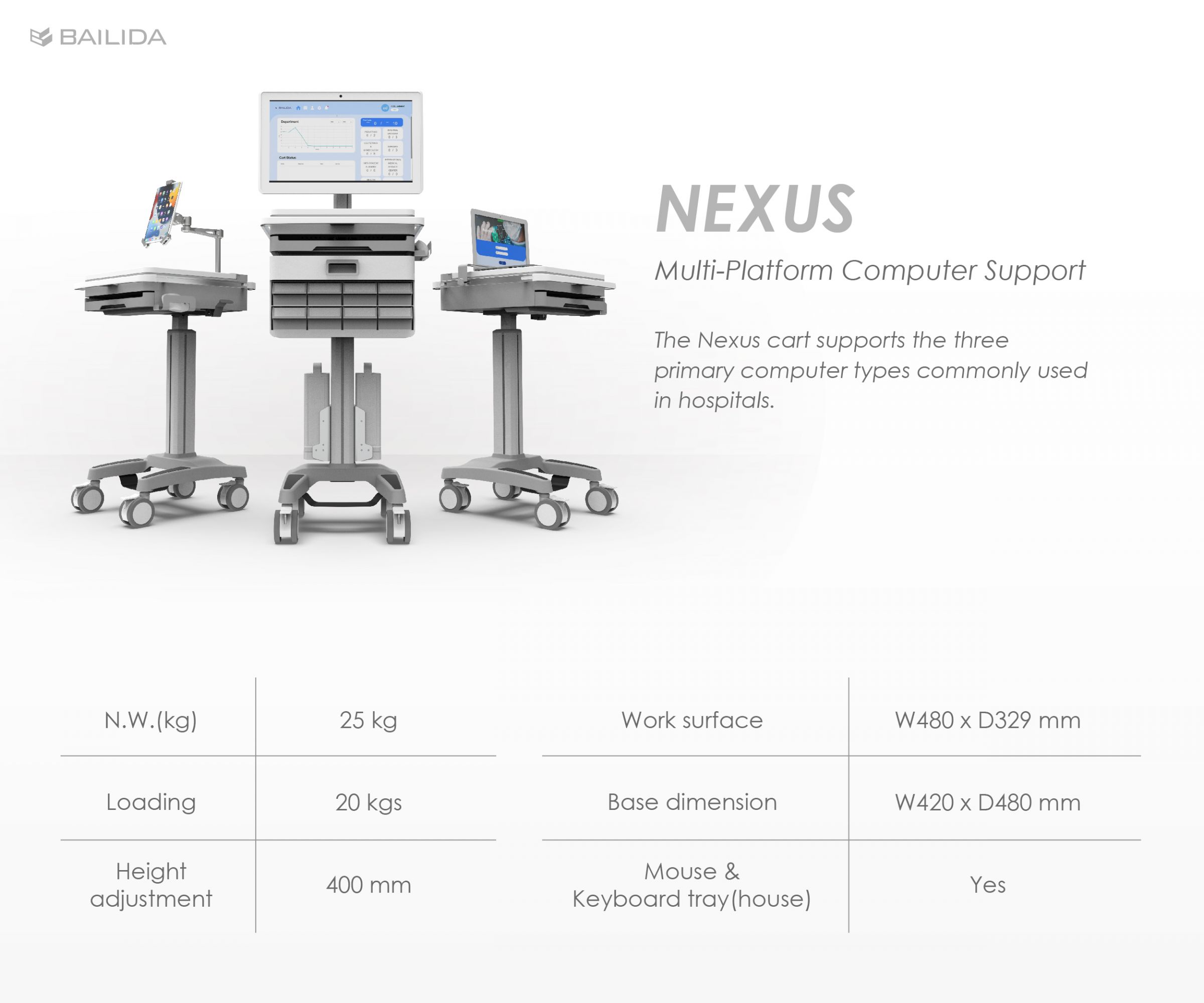 ワークステーション・オン・ホイールズ(WOW)、医療コンピュータカート、軽量電動カート、ポイント・オブ・ケアカート、エルゴノミック医療カート、EHR用モバイルワークステーション | 医療カート&医療ベッドサイドテーブルメーカー | BAILIDA MEDICAL